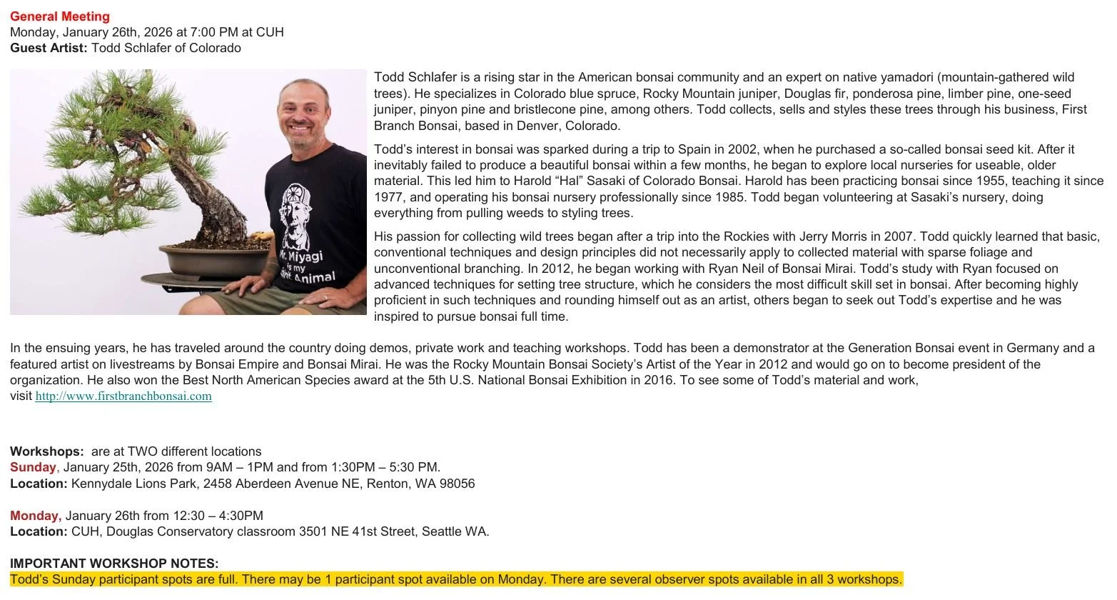January 26th at CUH - Technical Series 5:30 - 6:30, Will Schnicke on bonsai wound treatments.